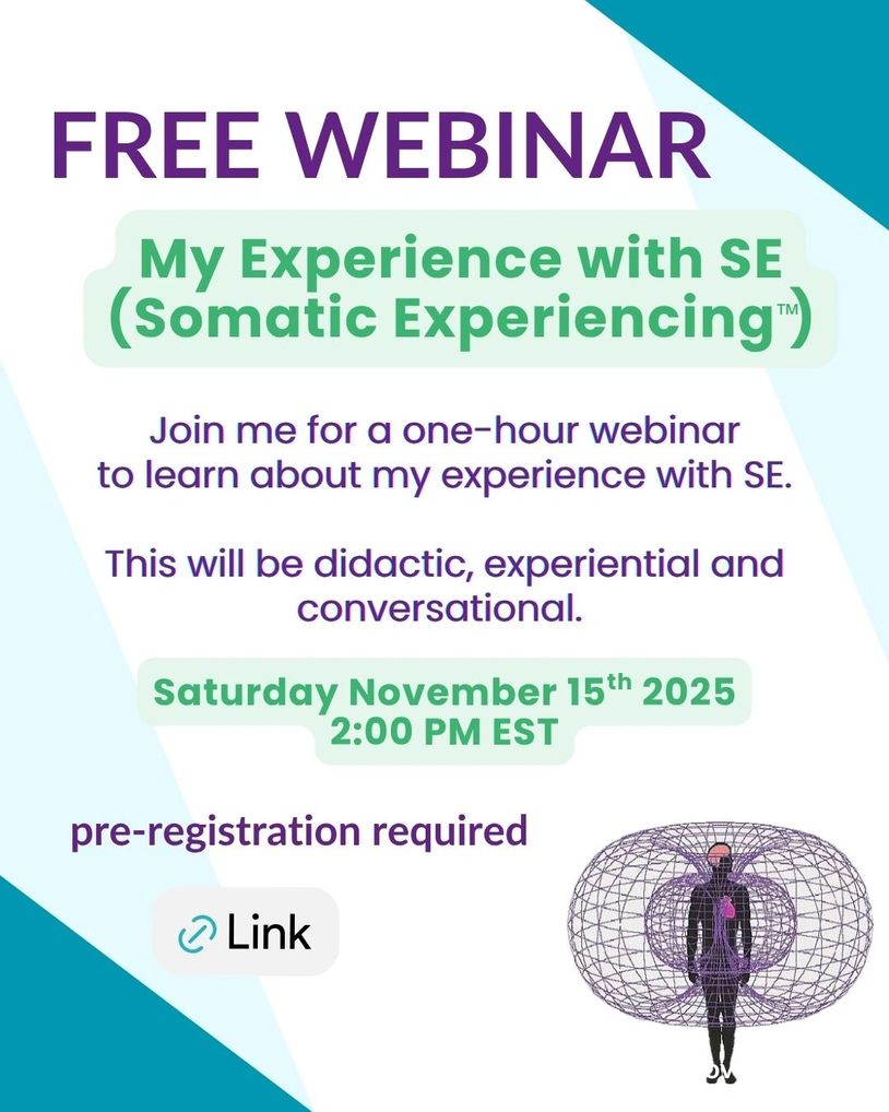 I will be holding a one hour webinar online to share my personal and professional experience with SE (Somatic Experiencing). The webinar is open to anyone. Therapists, Bodyworkers, SE Practitioners, Students, other Healthcare Professionals and anyone with interest in this subject. Learn about my experience and from my experience: the tools necessary to self regulate, and to be fully present in your life. Pre-Registration Required.